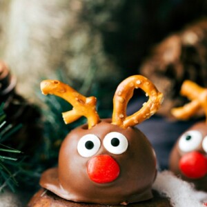 - Break the pretzels in half and press into the melted chocolate at the top. Press a red chocolate candy candy for a nose and then place 2 eye candies above the red candy for eyes.