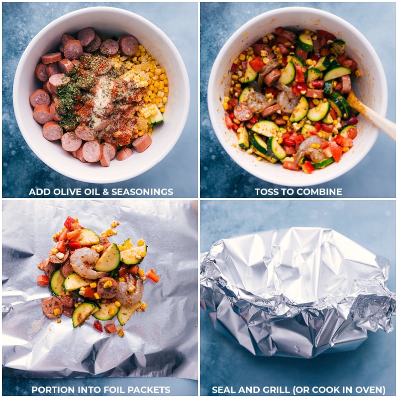 - In a large bowl, add the prepared veggies, sausage, shrimp, and garlic. Add olive oil and all the seasonings (adjust salt and pepper to taste). Gently toss to ensure everything is well coated in seasoning.