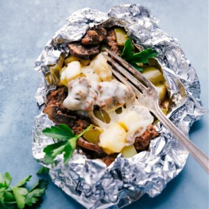 Our go-to campfire meals are Foil Pack French Dip Sandwiches and Tin Foil Sausage and Veggies, but I wanted to switch things up. Since Philly Cheesesteak Pasta is a family favorite, I turned those flavors into foil packsโand theyโve been a total hit!