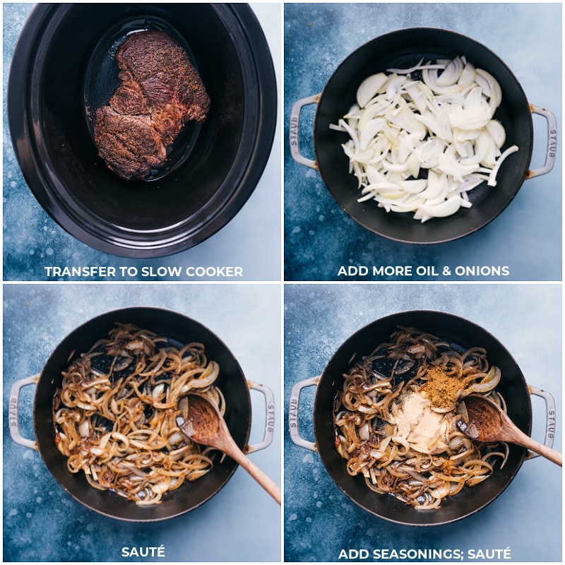 - Reduce heat to medium and add the remaining 2 tablespoons of olive oil. Add the thinly sliced onions and cook, stirring occasionally, until onions are translucent, about 3–5 minutes. Sprinkle in the seasonings: beef bouillon powder, garlic powder, onion powder, thyme) and stir until fragrant, about 30 seconds. Add Worcestershire sauce. Stir to combine. Pour in beef broth and deglaze the pan by scraping up the browned bits at the bottom with a wooden spoon or spatula as it bubbles. (This is where we get loads of flavor.)
