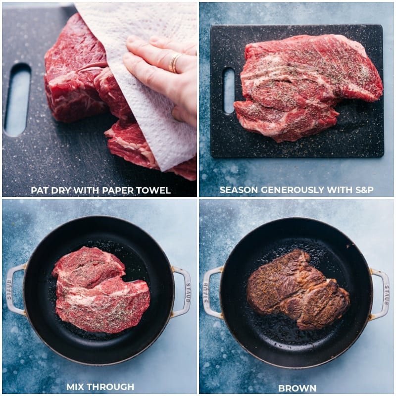 - Warm 2 tablespoons of olive oil in a large Dutch oven (or oven-safe heavy-bottomed pot) over medium-high heat. Once you can feel the heat when you hold your hand 6 inches above the pot, load in the beef. Brown for about 5 minutes or until you get a nice crust and it releases easily from the pan when lifted. Flip and brown for another 5 minutes. Don’t skip this step. We are adding layers of flavor here. Once the beef is nicely seared with a good crust, remove it and place it in the slow cooker.