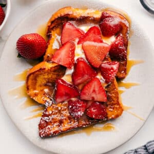 This is my favorite French Toast recipe—thick cinnamon-swirled bread, perfectly crisped, and topped with whipped cream, caramel syrup, and fresh strawberries.