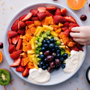Go all out with green fruits like honeydew, grapes, kiwi, and apples, and jazz up the dip with some green food coloring for a fun St. Patrick’s Day twist!