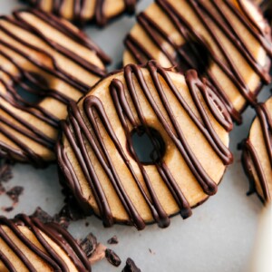After polishing off a fair amount of fudge-striped cookies during our last camping trip, I was inspired to try my hand at making my own. Not only was it fun to experiment and perfect this recipe, but these cookies also turned out to be surprisingly easy to make! Plus, no special cookie cutters are necessary! Instead of struggling with two cookie cutters, we shape the dough into a log and slice off rounds. A piping tip makes removing the center a breeze.
