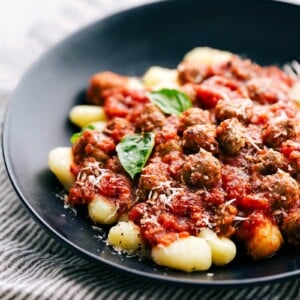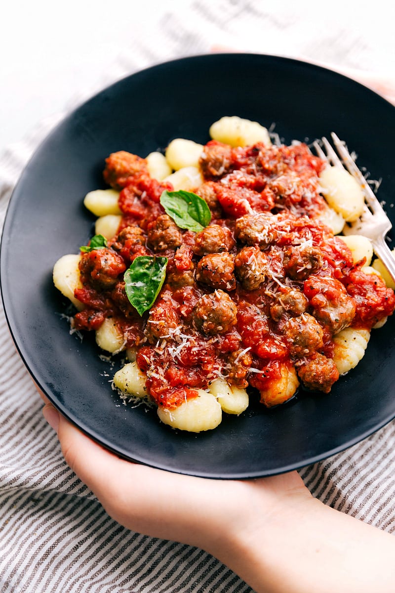 - Top the gnocchi with the meatballs and sauce. Garnish with fresh ribboned basil, additional cracked pepper, and freshly grated Parmesan cheese.