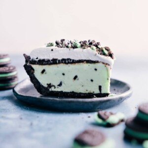 This pie starts with a sweet and butteryย Oreo Pie Crust. We then fill the crust with good mint ice cream, top with hot fudge, and finish it all off with a layer of sweetened whipped cream. I mean, whatโs not to love?!
