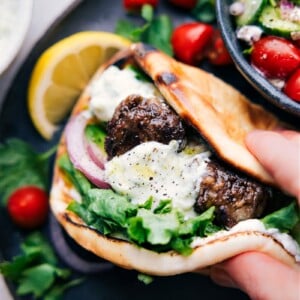 - Lightly toast the pita (see note 4). Spread 2 tablespoons of plain Greek yogurt inside each pita and sprinkle with salt to taste. Layer in lettuce, cucumber slices and, if desired, add in pickled red onions (see note 1). Add 4โ5 meatballs on top and drizzle lots of sauce over the pitas and enjoy promptly.