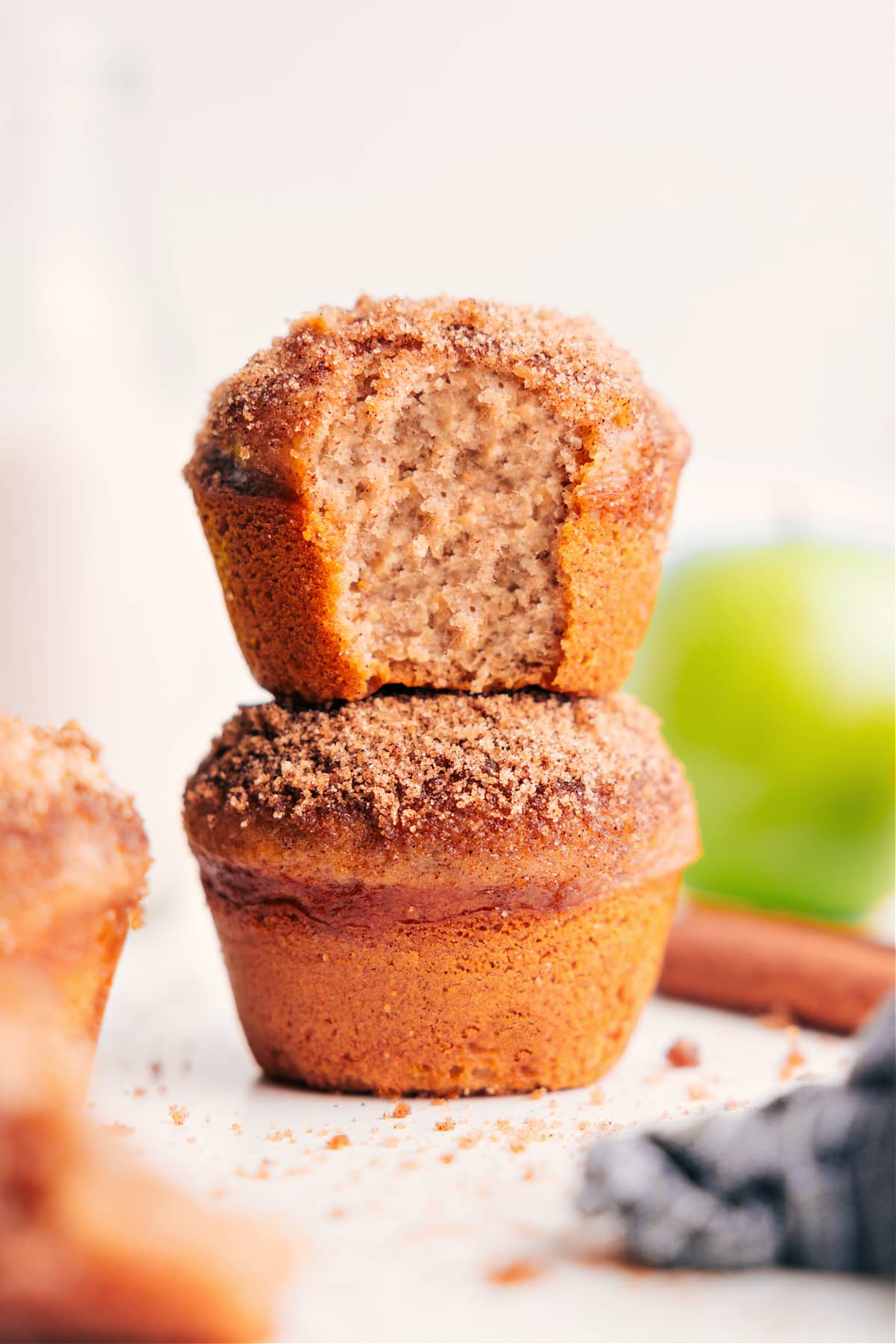 - From the โToppingโ section, mix apple pie spice with brown sugar in a small bowl. In another bowl, place melted coconut oil. Dip warm muffins in coconut oil, then in sugar mixture. Spoon extra sugar on top and press in. Repeat for all muffins.