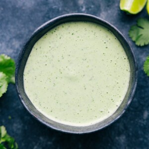My original Cilantro Lime Sauce is a go-to on so many recipes. I almost always have a batch of it in the fridge. Whether we’re drenching Shrimp Tacos, Baked Chicken Tacos, or Air Fryer Chickpeas, everyone goes crazy for it!
