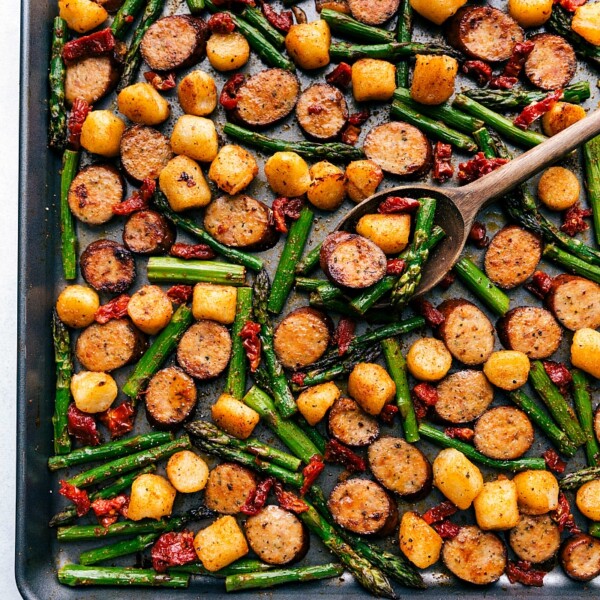 Made this for my husband and I. I used our local Lupoโs chicken Italian sausage and also added some asparagus to the vegetable mix.. We absolutely loved this recipe!! Definitely a keeper.