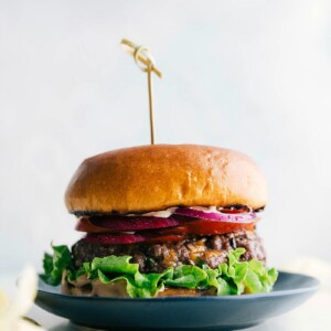 - Remove burgers and buns from grill and transfer to a clean platter. Let the burgers rest for 1–2 minute before serving. Assemble by adding burger sauce (see note 1) and your favorite veggies such as lettuce, tomatoes, pickles, red onion, etc.