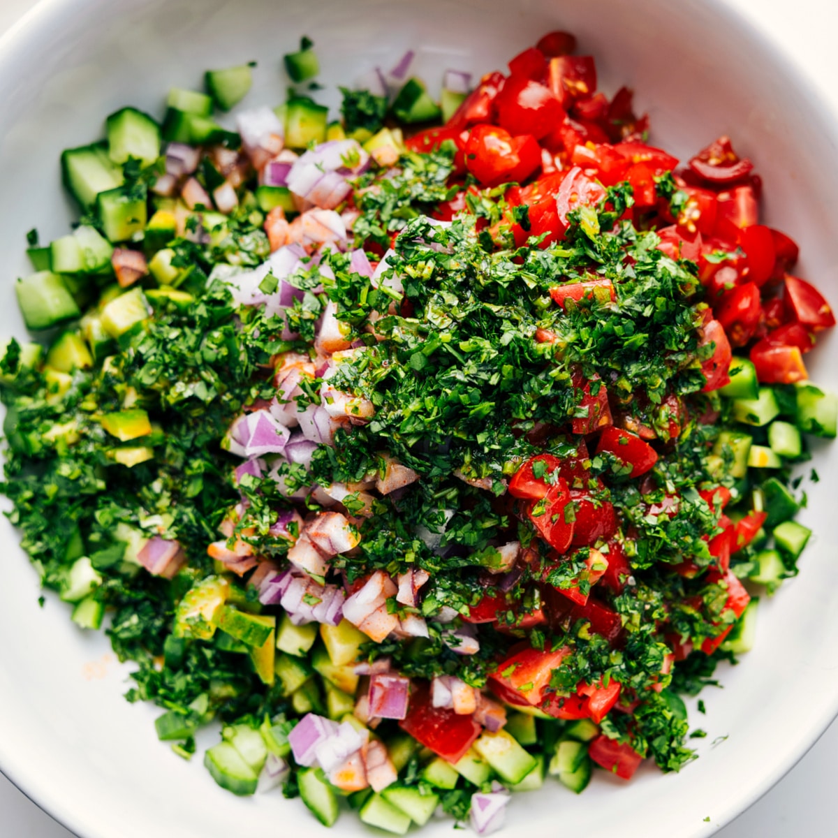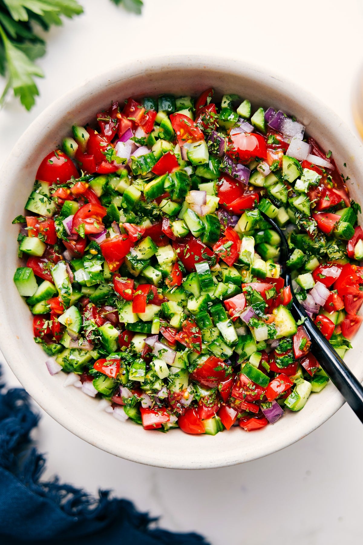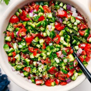 Israeli Salad Recipe is a quick, fresh salad loaded with crunchy cucumbers, juicy tomatoes, parsley, and a simple lemon dressing.