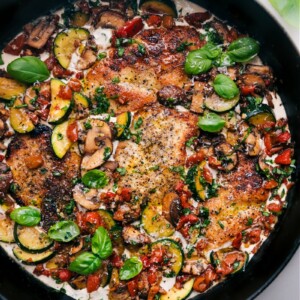 Zucchini, mushrooms, and roasted red bell peppers are sautรฉed in the same skillet used for the chicken.