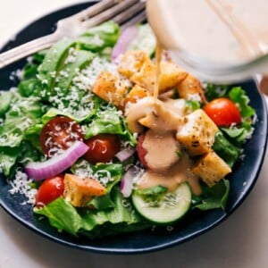 I started with a few of my go-to vinaigrette bases and kept testing and tweaking until I landed on this one, and now itโs easily my favorite dressing ever. Now I keep a jar of this Italian Dressing in my fridge at all times. I use it on simple salads, drizzle it over roasted veggies, dip a crusty baguette straight into it, and love it over grain bowls or paired with Italian chicken. Itโs one of those things that makes everything taste better.