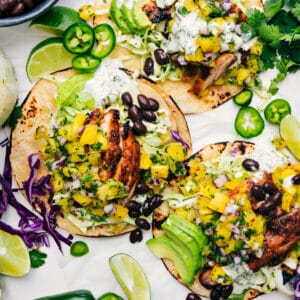 - To serve, char tortillas if desired (see note 3). Add sliced chicken and mango black bean salsa. Add sauce to taste. Add thinly sliced avocado if desired. Serve with lime wedges (or just squeeze fresh lime over everything) and additional cilantro if desired. Enjoy!