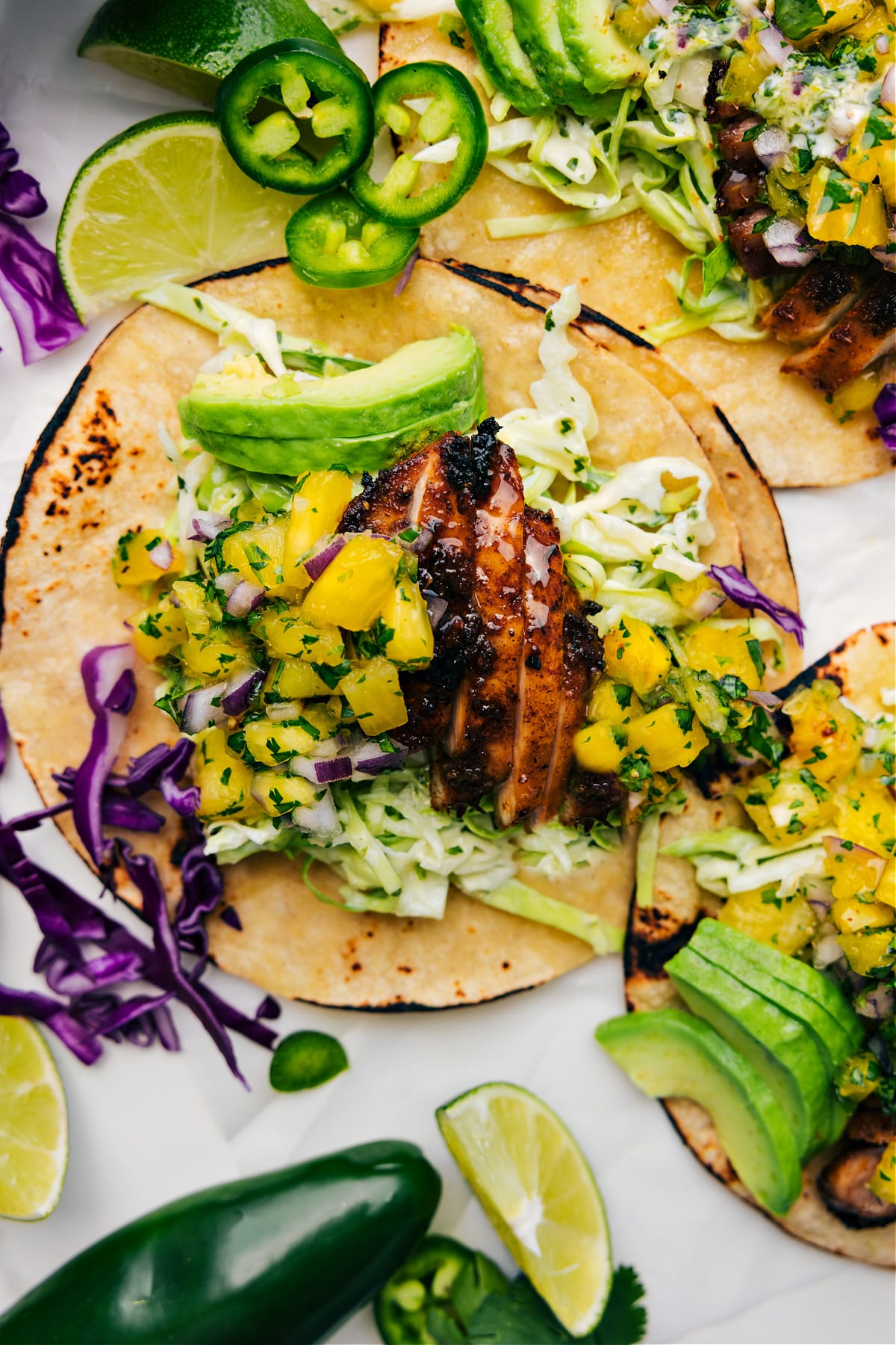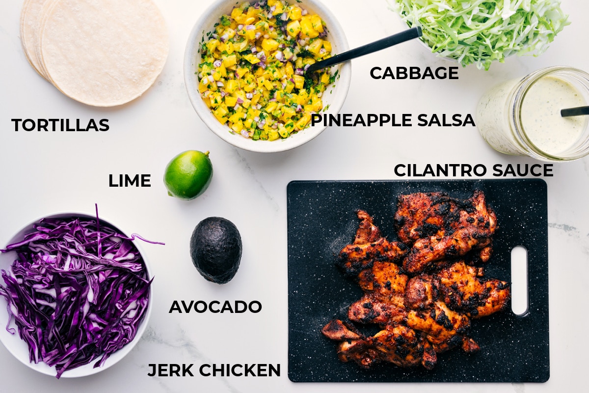 Jerk Chicken Tacos made with spice-rubbed chicken, a pineapple salsa, and a delicious jalapeรฑo-cilantro sauce.