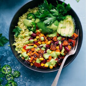 Itโs no secret we love big, loaded vegetarian bowls โ like theseย Nourish Bowls, Buddha Bowls, Sweet Potato Burrito Bowls, or Sweet Potato Couscous bowls to name a few favorites. And donโt forget these Black Bean Bowls, which have been on heavy repeat the last few months โ the cilantro-cashew sauce is completely addictive!