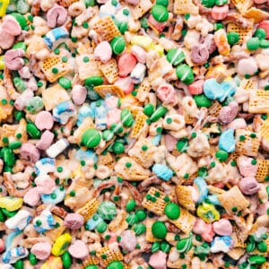 - In a large bowl, combine corn Chex, pretzels, Lucky Charms, Lucky Charms marshmallows, and 1/2 cup green M&M’s.
