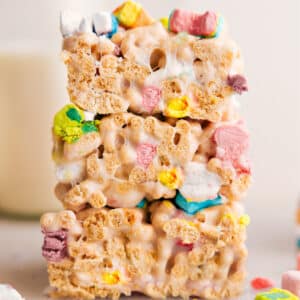 Growing up, Lucky Charms Bars were always a St. Patrick’s Day treat at my house. My mom would grab a big box of cereal, melt down some marshmallows, and we’d suddenly have a pan of delicious, colorful bars ready to go. I mostly remember hovering around the counter, picking out the rainbow marshmallows and hoping no one noticed.