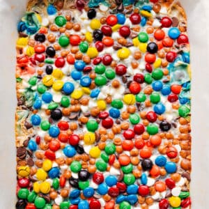 Magic Cookie Bars have a thick graham cracker crust and a mix of chocolate chips, M&Mโs, caramel bits, and oats, all held together by sweetened condensed milk!