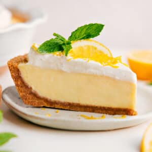 The crust is a quick graham cracker crust and the filling comes together in minutes. Itโs bright, sweet, perfectly creamy, and packed with lemon flavor. Add a big swirl of fresh whipped cream on top and itโs the perfect finish.