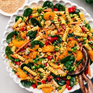 This is a step away from mayo-heavy pasta salads (still love you guys too!) to something fresh, bright, and Asian-inspired. It’s got crisp veggies, juicy mandarins, crunchy almonds, and an insanely good dressing.
