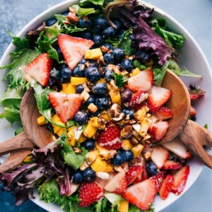 - Salad: Add lettuce to a large bowl. Top with blueberries, strawberries, and mango. Add in the almonds. Drizzle the dressing (see note 1) over the salad. You may not want all the dressing, so add to personal preference. Toss and enjoy!