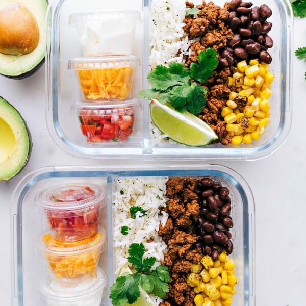Chicken Burrito Bowls combine deliciously seasoned chicken, cilantro-lime rice, and your favorite toppings for a delicious meal. Great for meal prepping!
