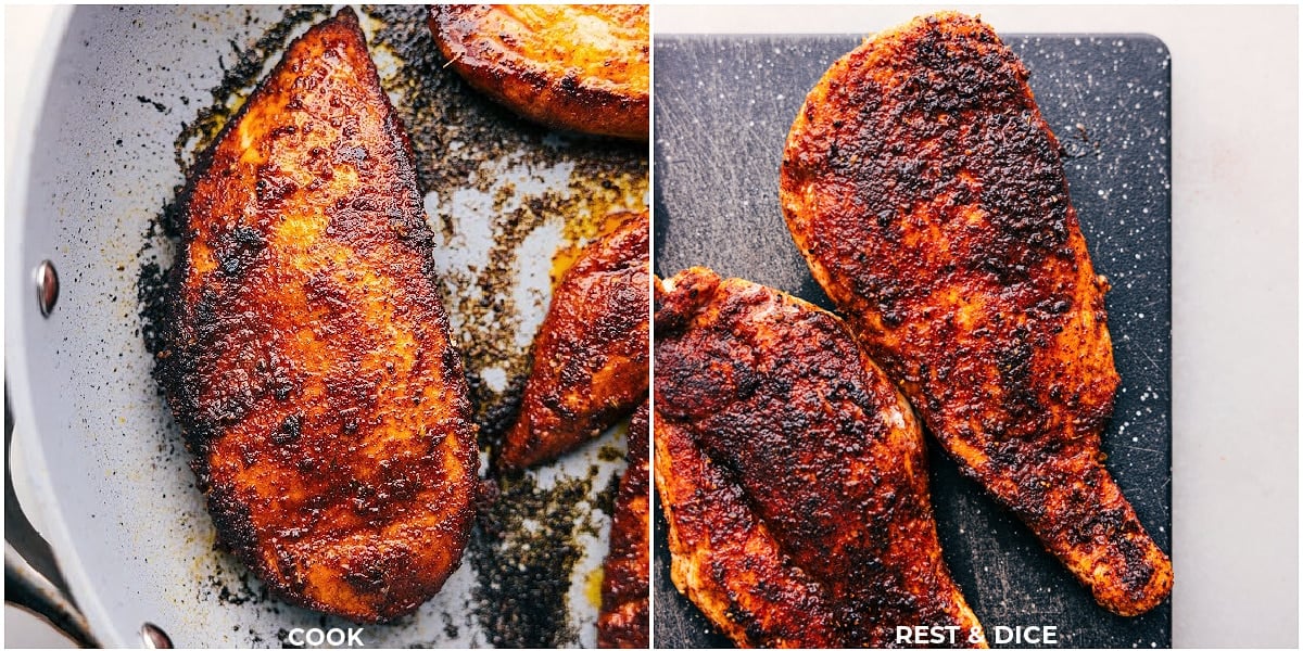 - Cook Chicken: Heat oil in skillet, cook chicken, then let rest.