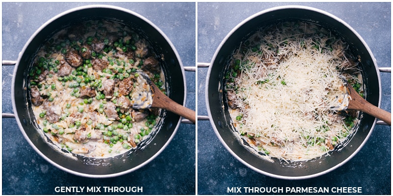- Raise the heat to bring the mixture to a simmer, then reduce to maintain a gentle bubble. Cook uncovered for 7 minutes, stirring occasionally and scraping the bottom to prevent sticking. The pasta should be almost tender after this time, and the mixture will still be soupy. Add the sausage mixture and stir gently. Sprinkle with 3/4 cup Parmesan and stir until melted. Season with salt and pepper to taste, enhancing the overall flavor.