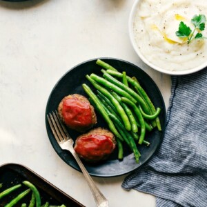 Meatloaf Dinner made easy! Mini meatloaf, creamy mashed potatoes, and roasted green beans all bake together on ONE sheet pan.