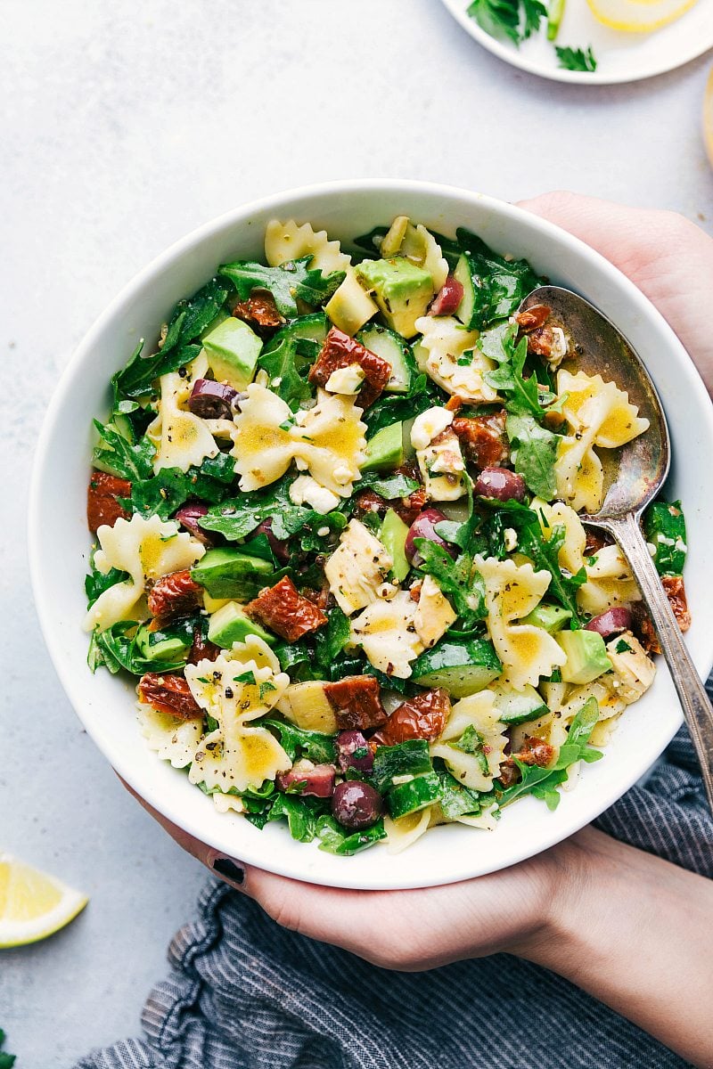 This pasta salad can easily double or triple. It scales well up or down. Just divide or multiply the ingredients based on how many people you’re feeding.