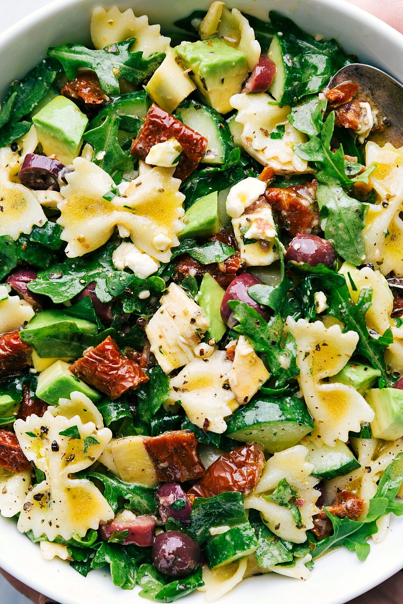 - Add chopped rotisserie chicken, sun-dried tomatoes, coarsely chopped artichoke hearts, chopped cucumber, coarsely chopped olives, arugula/spinach blend, and parsley to a large bowl, along with the pasta. If eating right away, also add the feta and avocado. (If not eating it right away, cover the salad and refrigerate without feta and avocado—see storage below).