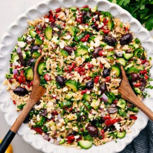 - Dressed Salad: Doesnโt store well. Veggies soften and orzo bloats from the dressing.