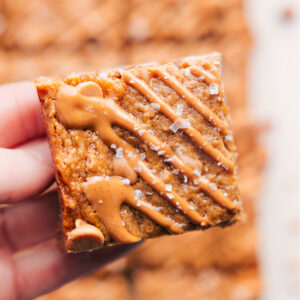 I’m truly obsessed. Like best breakfast bar I’ve ever had and I don’t say that lightly. They’re soft, chewy, and taste like a cross between a peanut butter cookies and oatmeal, but they’re made with minimal refined sugar, no flour, and plenty of peanut butter to keep them filling with a boost of protein.