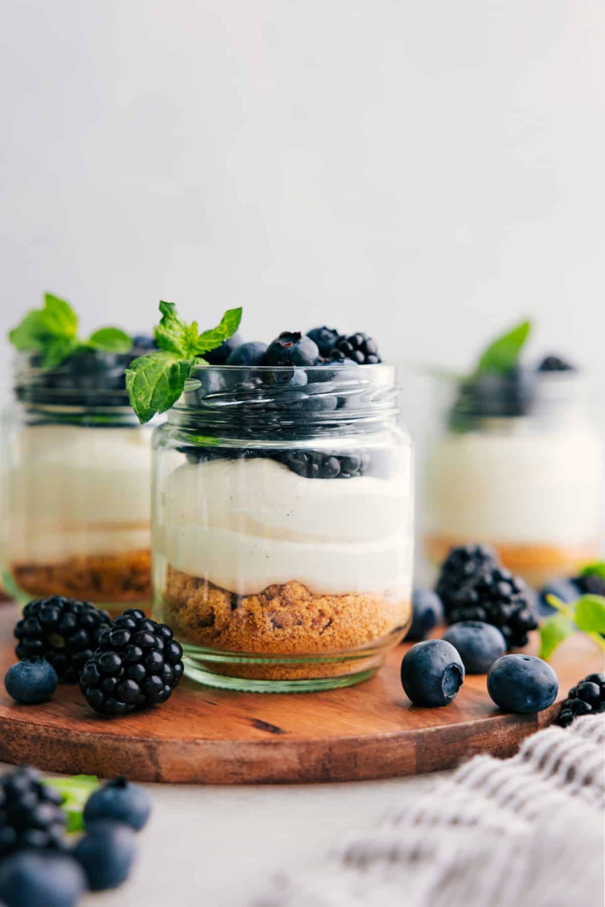 Cheesecake In A Jar is a fun, no-bake dessert that is delicious and easy to customize! Serve with your favorite toppings like fresh berries, berry sauce, chocolate sauce, or caramel.