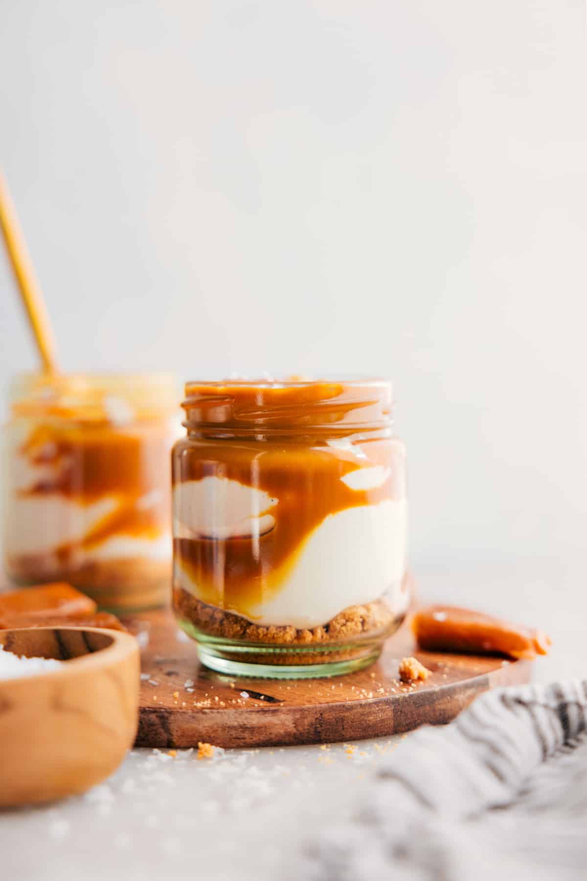 You can arrange the jars (without toppings) on a table and serve all kinds of toppings on the side so guests can add whatever theyโd like. This makes for such a fun party dessert.