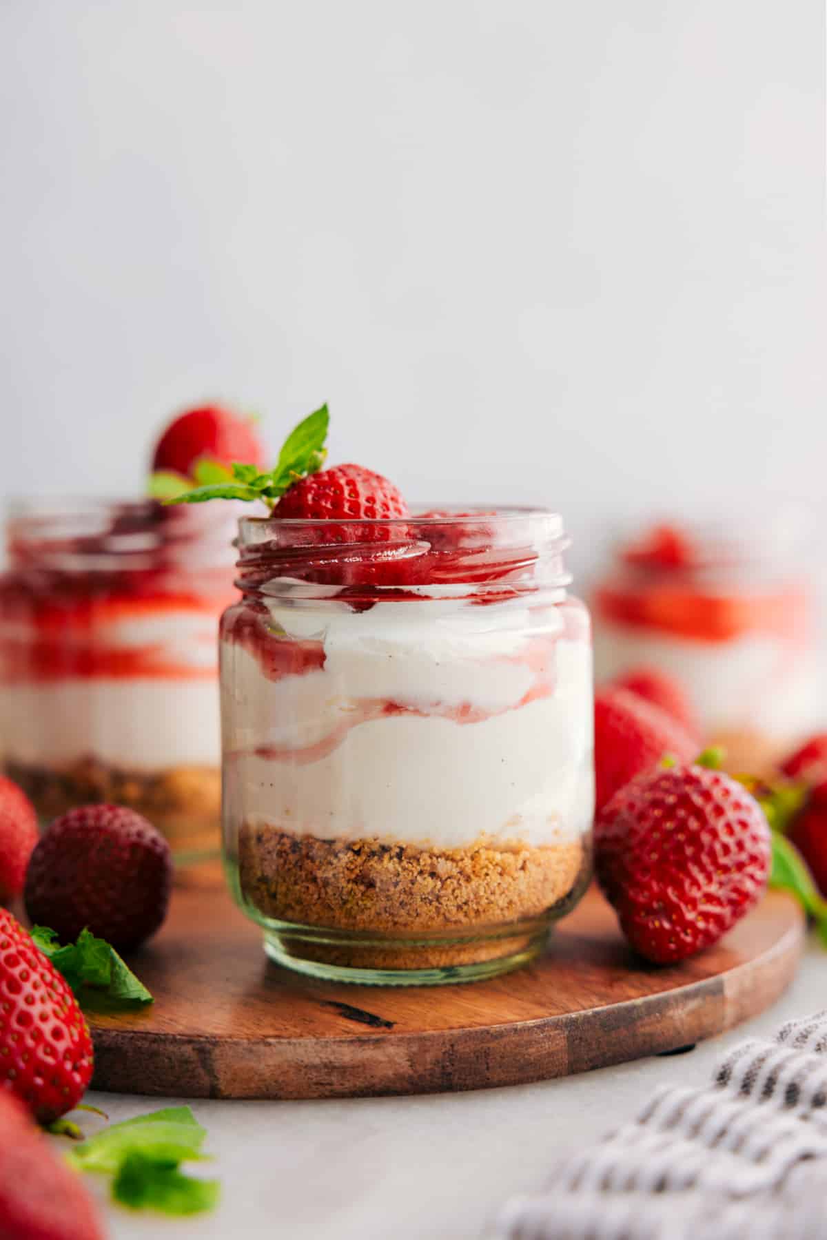 These cheesecakes in a jar are the perfect dessert for serving guests or hosting an event. I love making them for bridal or baby showers or girlsโ nights. Everyone always loves them โ not only are they delicious, but theyโre also so cute and fancy.