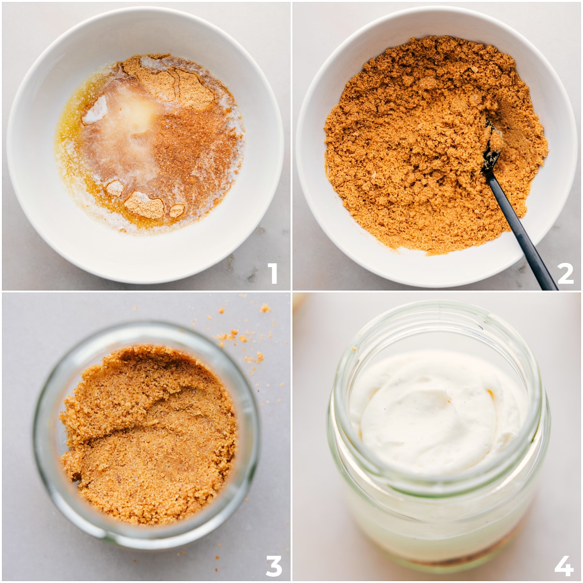 - Press Crust: Divide the mixture among mason jars and gently press down with a milk bottle cap. The crust should be loose, not firm like a traditionalย Graham Cracker Crust.