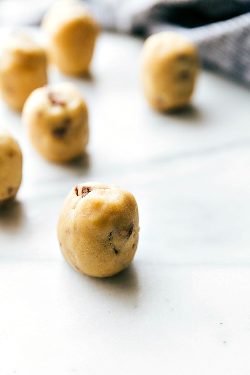 - Preheat oven to 350°F. Line a sheet pan with parchment paper. Measure 1-1/2 tablespoons (or 30 grams) of dough per cookie ball. Roll the balls so they are taller rather than wider. Place 6 cookie dough balls on the sheet pan and place in the freezer for 8 minutes. Remove and bake for 8–11 minutes or until no longer glossy on top. I like them best at 9 minutes; slightly underbaking will yield super-soft and chewy cookies. Remove from the oven and let cookies stand on the sheet pan for 5 minutes. If desired, press a few more chocolate chips into the tops of the cookies.