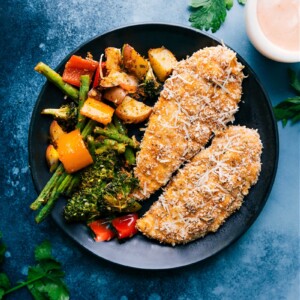 - Carefully remove chicken and add remaining 1/3 cup Parmesan with veggies. Toss the veggies with the cheese and any panko breading that fell on the tray from the chicken. Enjoy chicken and veggies with optional dipping sauces (see note 4).