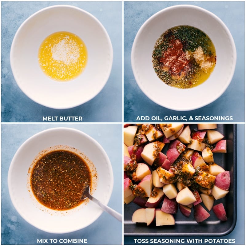 - In a small bowl, add melted butter, olive oil, garlic, dried parsley, dried oregano, garlic powder, seasoned salt, paprika, and optional cayenne pepper. Stir or whisk until completely combined. Remove 2 tablespoons of this mixture and toss with the potatoes until well coated. Space out potatoes in an even layer and bake for 15 minutes.