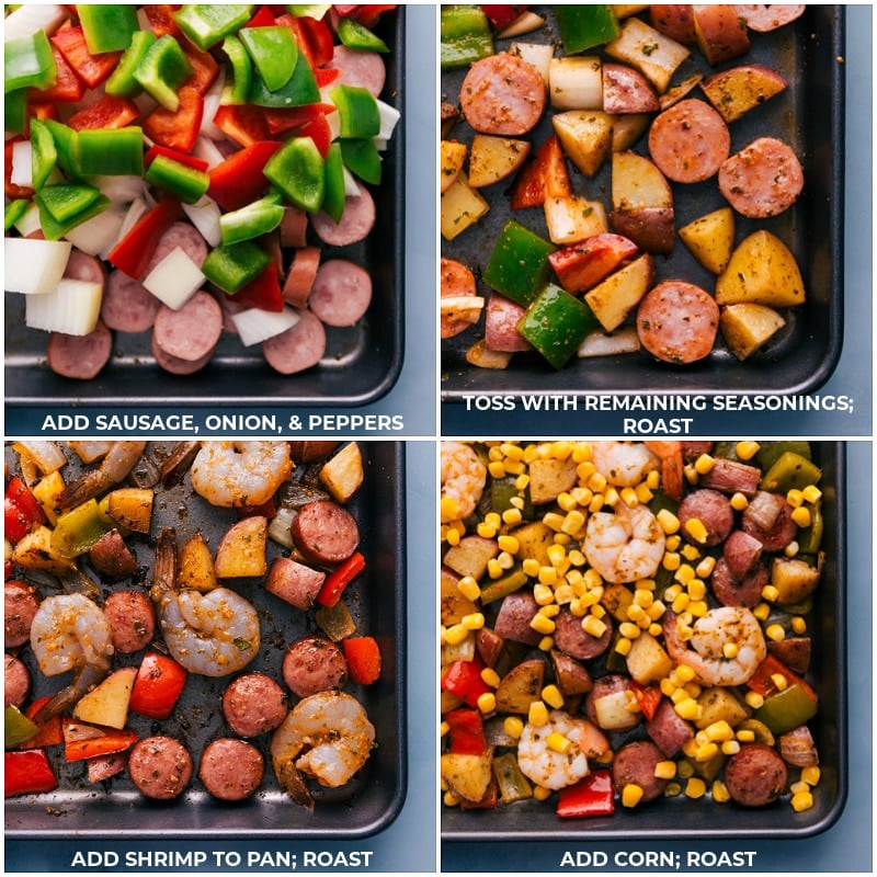 - Remove from oven and toss again, spacing veggies out again. Add the shrimp to the pan and bake another 6 minutes or until shrimp is cooked through and veggies are crisp-tender. Add frozen corn on top and bake for 1 more minute. Toss everything once more.