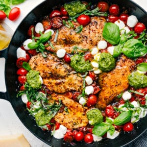 What makes this version better than the others? It’s fast (done in 30 minutes or less), all made in one pan, and actually tastes like something you’d get at a good restaurant. The tomatoes blister just enough to create a quick, flavorful sauce, and the melty cheese + pesto combo is next-level good!