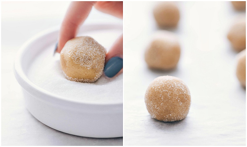 - Use a 1-tablespoon measuring spoon to lightly pack in the dough and level it off. This is the exact dough ball size you need! Roll that dough in a ball, then roll to coat in the sugar. If the dough is starting to get too warm from rolling, chill the dough balls on the sheet pan for 5–10 minutes before baking to avoid spread.