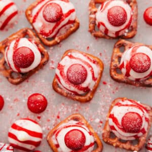 These pretzel bites taste just like peppermint bark but are quicker to make! You get the crunch from the pretzels, peppermint white chocolate from the kisses, and a touch of milk chocolate from the M&Ms.