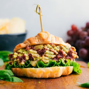 Every time I visit a soup, salad, and sandwich spot, I order a pesto chicken salad if itโs on the menu. Now Iโve created my own version, and itโs truly my dream sandwich! Buttery croissants with crisp lettuce, pesto-coated chicken, roasted peppers, sun-dried tomatoes, and crunchy almondsโpure heaven!