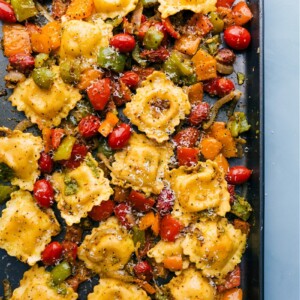 - When veggies finish roasting, remove from oven and immediately toss drained ravioli on top. Spoon the pesto evenly over everything and toss on the sheet pan to combine. Return to oven for 1โ2 minutes.