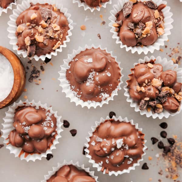 - Working with one chilled caramel cluster at a time (keep the rest in the fridge), dip into the melted chocolate. Lift with a fork, tap the fork on the edge of the bowl to remove extra chocolate, then place the coated cluster back on the parchment. Repeat with all clusters. If you'd like, add a tiny sprinkle of sea salt on top.