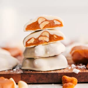 As much as I love a good dark or milk chocolate bar, white chocolate will always have my heart. So when I first tried the See’s Polar Bear Paws, I instantly knew I had to make my own version at home. And just like my Turtles where I swap in candied pecans for extra flavor, I knew these would shine even more with honey roasted peanuts instead of plain. Oh my gosh…wow.